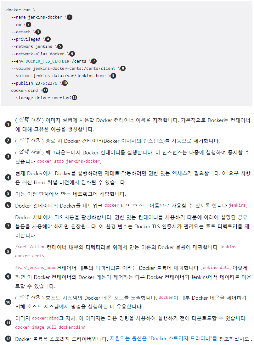 Jenkins 노드 내에서 Docker 명령을 실행하려면 docker:dind다음 docker run 명령을 사용하여 Docker 이미지를 다운로드하고 실행하십시오.