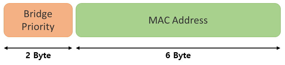 브리지 ID는 2Byte의 Bridge Priority와 6Byte의 MAC Address로 구성되어, 총 8Byte 크기다.