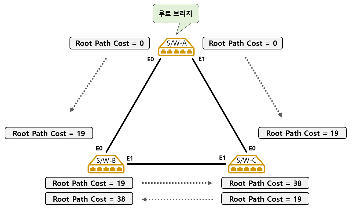 이 경우 Path Cost는 19가 된다. 따라서 스위치 B의 E0 포트에서는 Root Path Cost 값이 0 + 19 = 19 가 된다.