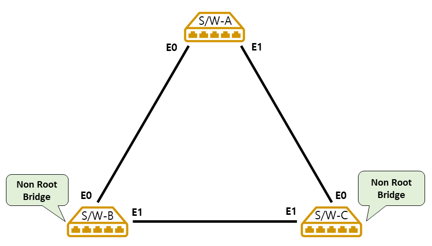 Root Path Cost 값이 낮은 스위치 B의 E0 포트와 스위치 C의 E0 포트가 루트 포트로 선정된다.