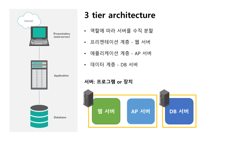 3 tier architecture는 역할에 따라 3개의 서버로 수직 분할한 구조를 뜻합니다.