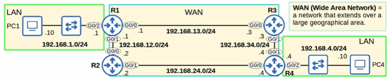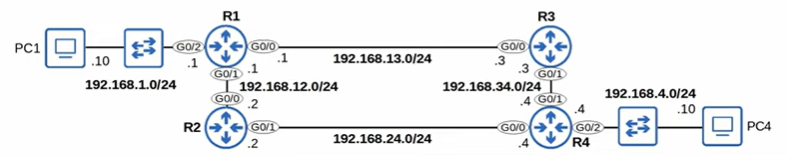 그리고 R1과 R4에는 LAN이 연결되어 있다.