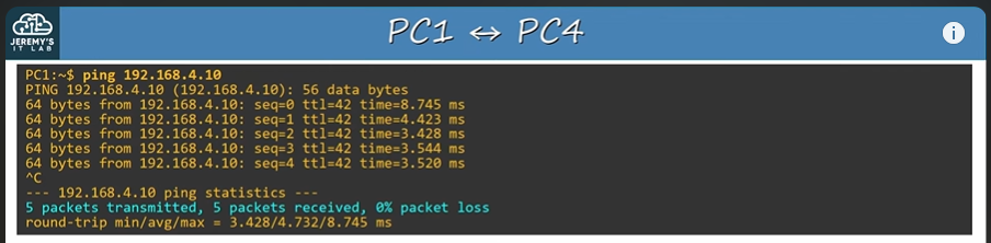 테스트하기 위해 PC1에서 PC4로 ping을 보냈고 성공했다.