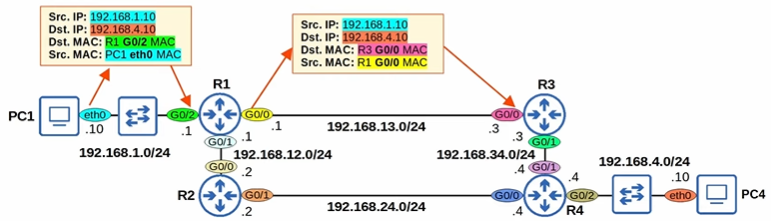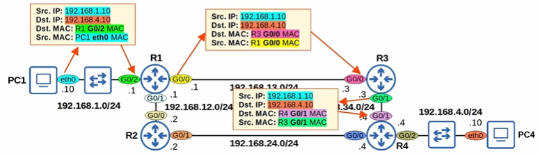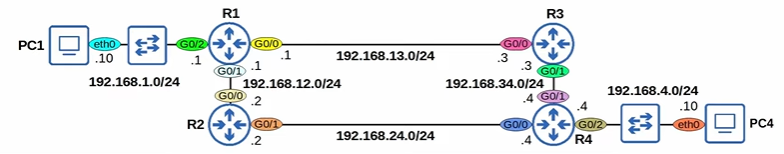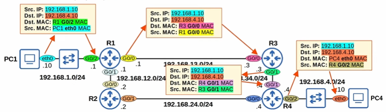 - 1) PC1 → R1 → R3 → R4 → PC4
