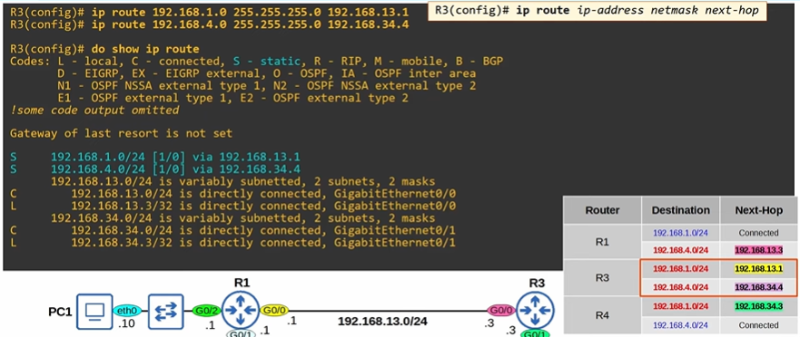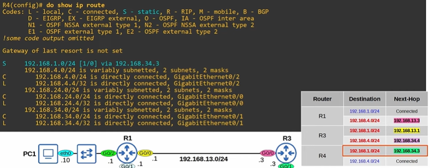 R4(config)# ip route 192.168.1.0/24 255.255.255.0 192.168.34.3