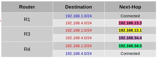 그 이후에는 R3가 패킷을 처리한다. - 마찬가지로 R4에는 R1과 R3를 잇는 192.168.13.0/24로의 경로가 필요하지 않다.