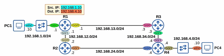 - 2) PC1 → R1 → R2 → R4 → PC4