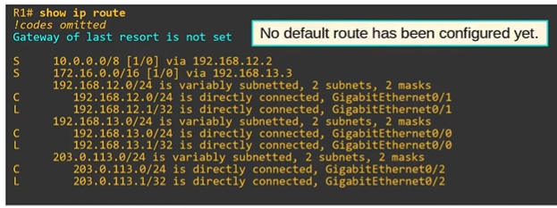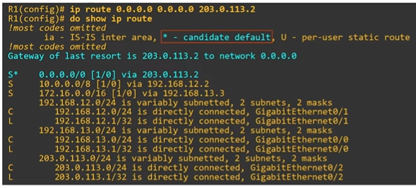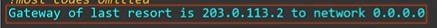 203.0.113.2를 통한 0.0.0.0/0 정적경로임을 나타내는 S 코드 옆에는 별표가 있다.