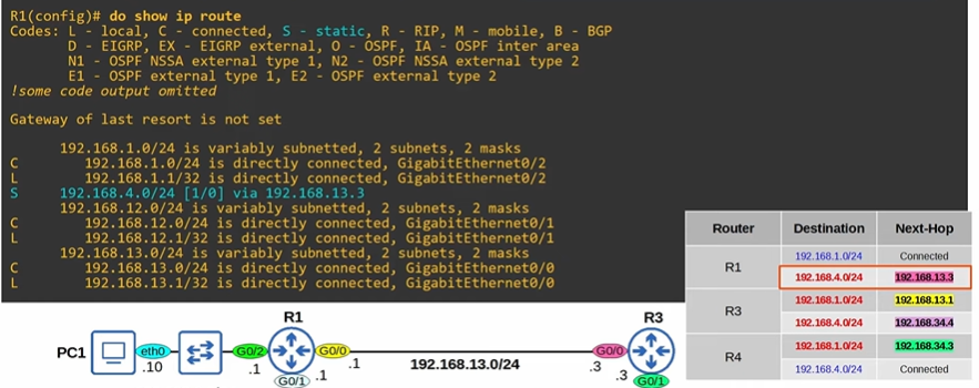 R1(config)# ip route 192.168.4.0 255.255.255.0 192.168.13.3