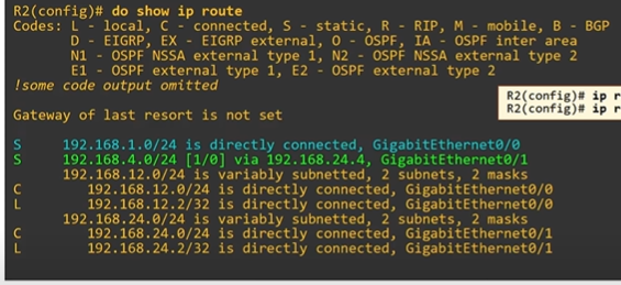 해당 네트워크는 R2에 직접 연결되어 있지 않지만, 출구 인터페이스만 구성하면 라우팅 테이블에 표시된다.