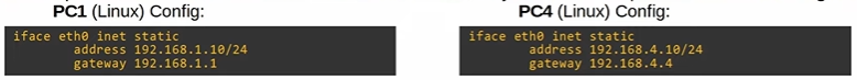 - 이것이 PC1과 PC4의 구성이다. Linux에서는 인터페이스 구성이 편집할 수 있는 텍스트 파일에 저장된다.